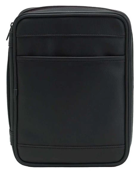 This Bible cover is fashioned from soft nubuck leather. It’s soft like suede, but more durable because it’s the outside of the skin that’s sanded. Inside your cover is our luxurious dura-pad lining, which will cradle and protect your Bible for years to come. Also inside is a satin ribbon bookmark and handy penholder. Carrying handle is accented with a silver open fish emblem. Other features include reinforced stitching, lay-flat construction, and non-rusting, self-repairing zipper. Front storage pocket. The Large size fits Bibles and books up to about 6 ½” x 9 ¼” x 1 ¾”.