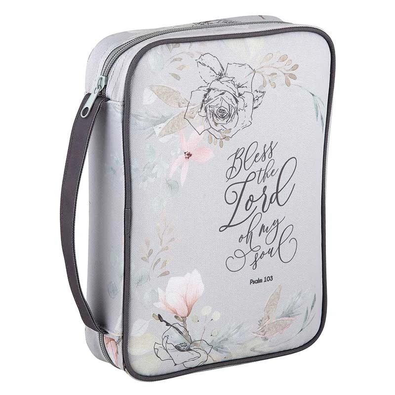 Fits standard sized Bibles. Zippered pocket on the back, Ribbon bookmark and two pen holders– 100% Polyester — 7″ W x 10″ H x 2″D