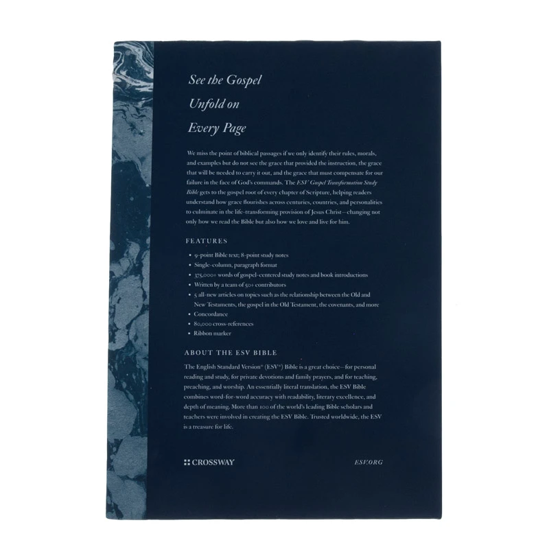 The ESV Gospel Transformation Study Bible is designed to help readers see Christ in all of Scripture, and grace for all of life.It features book introductions, gospel-centered study notes, and a series of all-new articles?written by a team of over 50 pastors and scholars. This content explains passage-by-passage how God’s redemptive purposes culminate in the gospel and apply to the lives of believers today.Readers will be challenged to see how the message of the gospel transforms sinners from the inside out. Over 375,000 words of gospel-centered study notesIntroduction that outlines specific uses for the BibleUpdated design and typesetting based on the original ESV Gospel Transformation Bible released in 2013Includes 5 new articles on topics such as the relationship between the Old and New Testaments, the gospel in the Old Testament, the covenants, and moreBook introductionsLifetime guaranteeConcordance80,000 cross-referencesRibbon markerSmyth-sewn bindingSize: 6.125″ x 9.125″9-point Bible text; 8-point study notes2,096 pagesSingle-column, paragraph formatPackaging: Slipcase