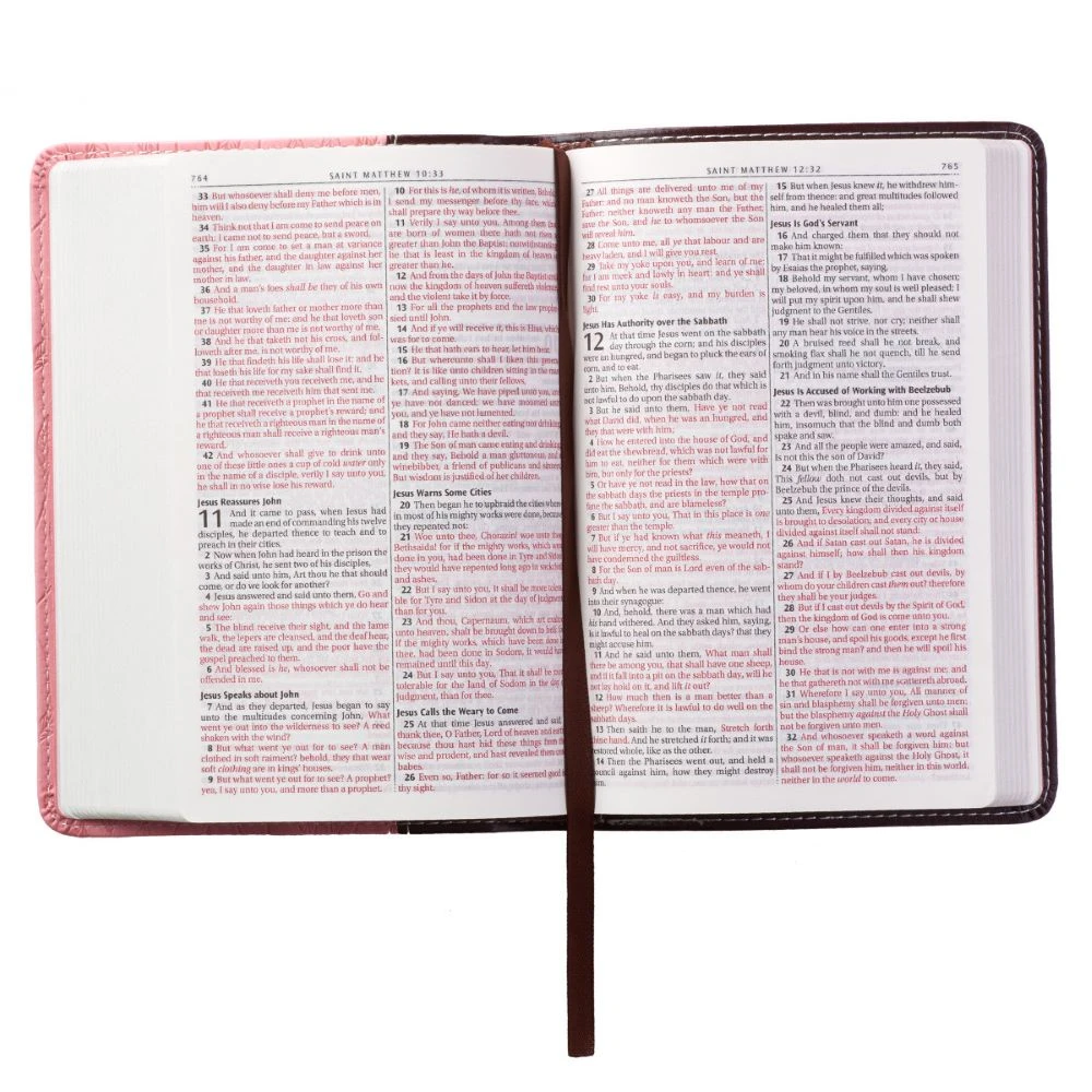 This beautifully designed two-tone Burgundy and Pink Faux Leather King James Version Compact Bible will make a lovely addition to your nightstand for