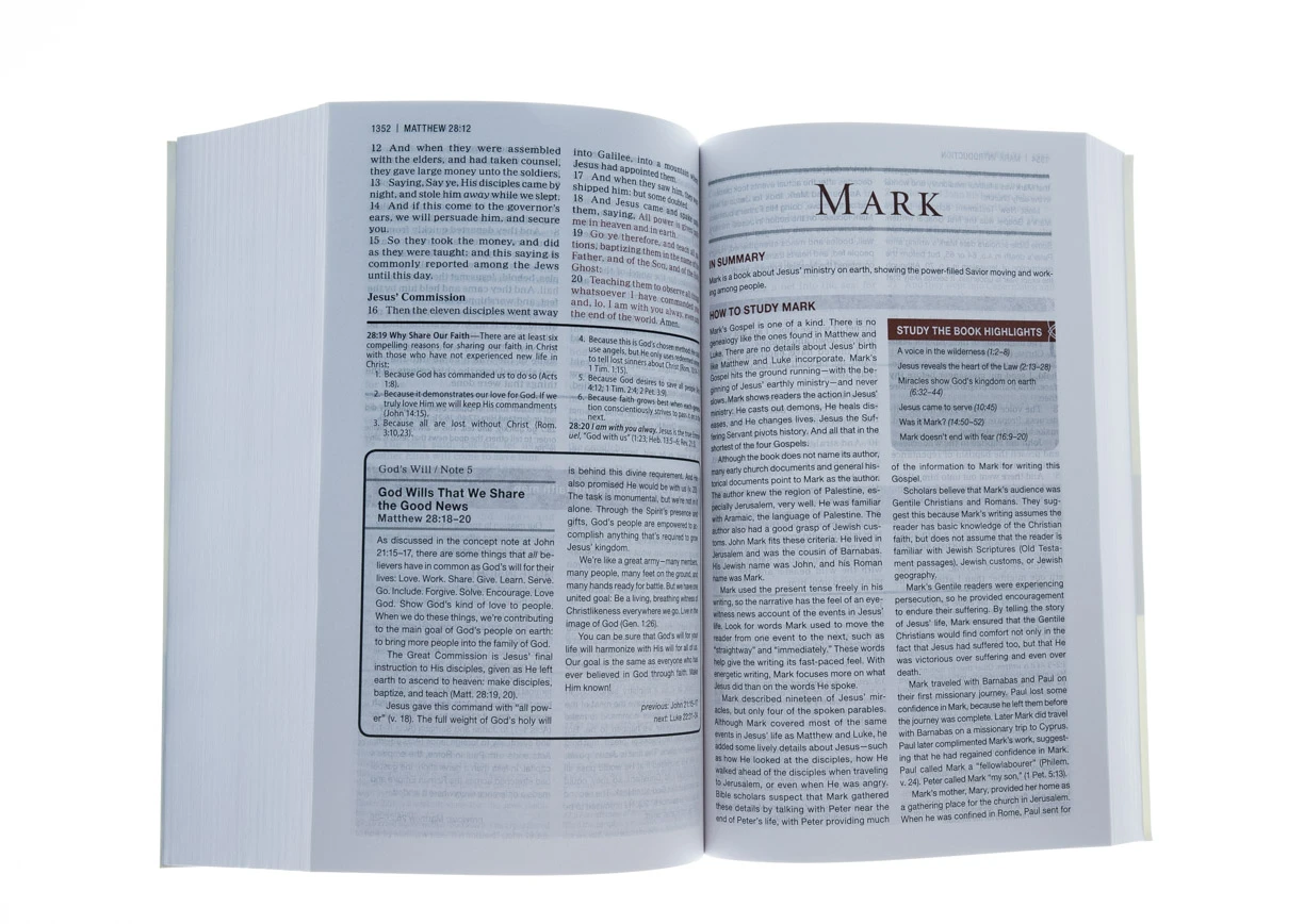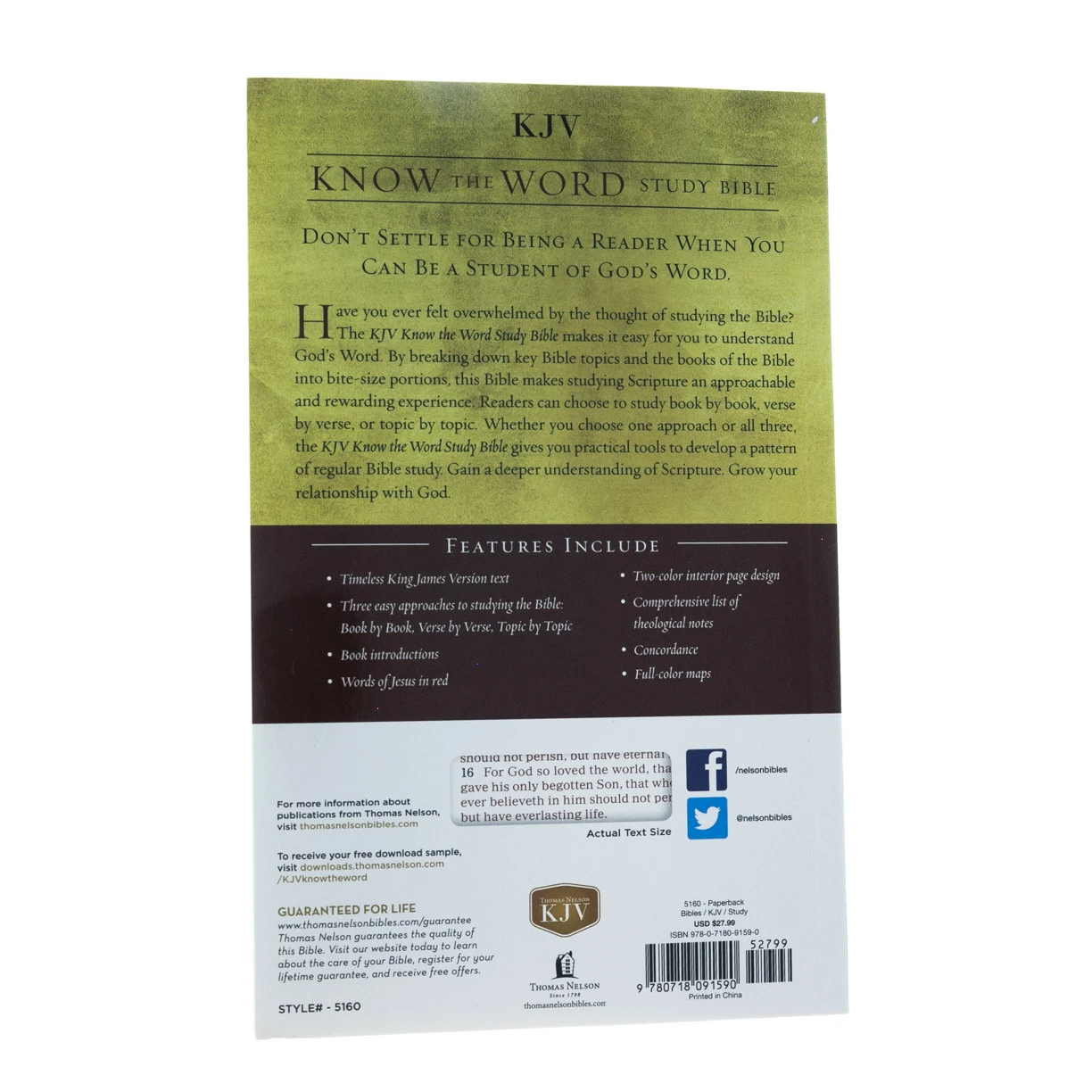 The KJV Know the Word Study Bible offers three easy ways to begin studying Scripture and helps individuals transition from being a casual reader of the Bible to becoming a regular student of the Bible. You can choose to study the Bible book-by-book, verse-by-verse, or topic-by-topic; each path offers powerful insights that will help you develop a daily routine of Bible study. The book-by-book series of notes leads you through the main points of each book of the Bible. The verse-by-verse notes help you to dig deeper into Godâs Word. The topic-by-topic articles, which cover 21 theological topics, guide you through a series of insightful notes and give you a thorough biblical understanding of each topic. With the beautiful and timeless text of the KJV translation, the KJV Know the Word Study Bible offers you choices of how to study Scripture and grow in your relationship with Christ.Features Include:⢠King James Version Bible text⢠Three easy approaches to study the Bible: 1. Book by Book; 2. Verse by Verse; 3. Topic by Topic⢠Insightful introductions for each book of Scripture⢠Words of Jesus in red⢠Beautiful two-color interior page design⢠Comprehensive list of theological notes⢠Concordance⢠Full-color maps
